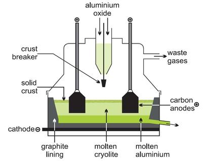- Aluminium is attracted to the negative cathode and sinks to the bottom of the tank where it tapped off