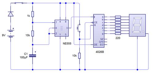 555 Astable and Seven Segment - This circuit uses the 555 timer to produce the continuous digital pulse which is sent to the 'clock' input of the 4026 seven segment driver. As each full pulse if received (0,1) a binary number is sent to the display to control each LED segment. The numbers are only displayed ascending 0 - 9 and back again