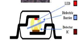 An Opto-Isolator is a component that allows the switching between circuits with differing voltages much like a Relay. Encased in a 4/6/8 Pin DIL IC is a infrared LED and an infrared phototransistor, separated by a small gap. When the LED is on the phototransistor conducts allowing the attached circuit to become active. As with a relay, no electrical connection is made between the two circuits