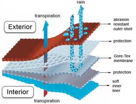Gore-Tex is a trademarked material developed from Teflon as a breathable, water-proof membrane for use in textiles. It's unique property is that it is impermeable one way but will allow water vapour to pass through the other. This makes it ideal for sportswear as it allows the user to stay dry whilst allowing airflow to the body and restricts wind flow in keeping the user warm.